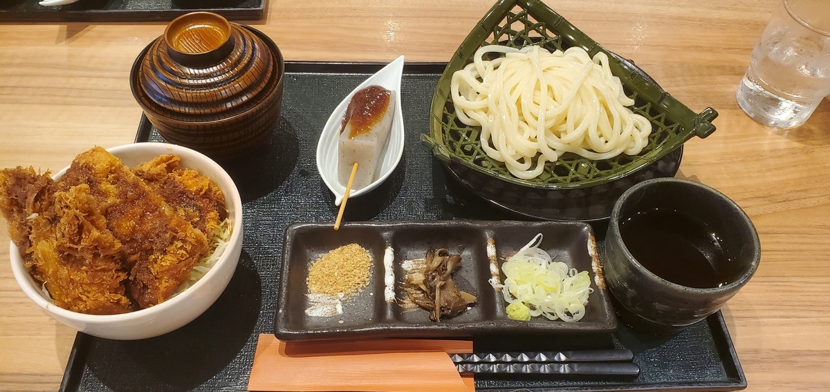 コラボメニューの「水沢うどんとミニソースカツ丼」。うどんよりカツ丼の方が量が多く、「ソースカツ丼とミニ水沢うどん」じゃないか?と食べてから思ったが、朝から何も食べていない身としては大変満足できるボリューム感だった。