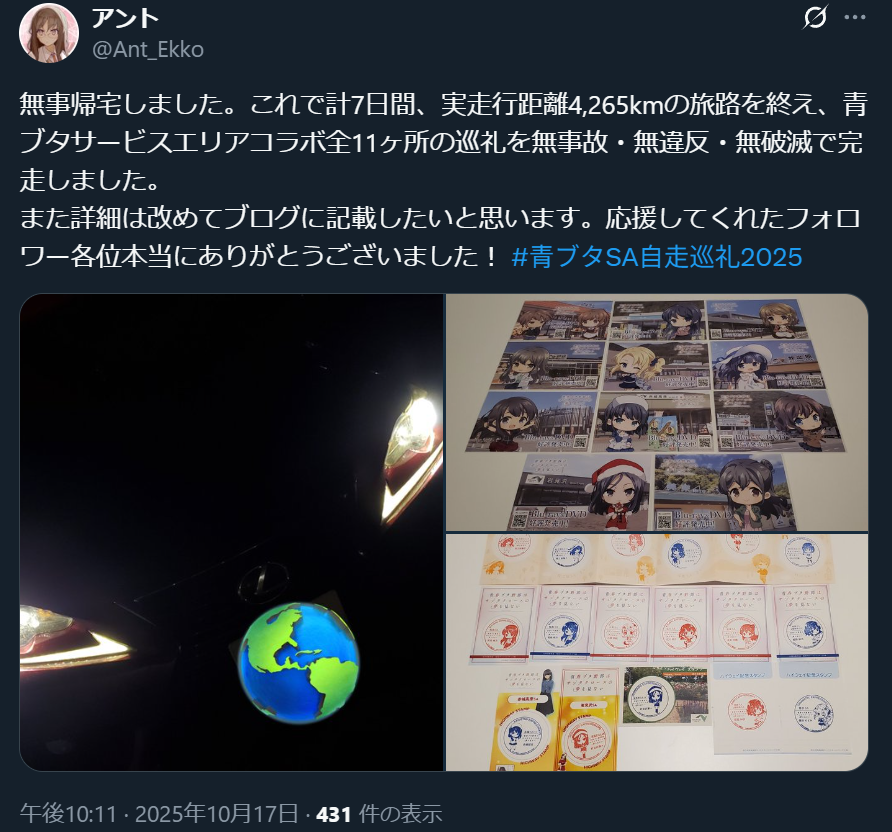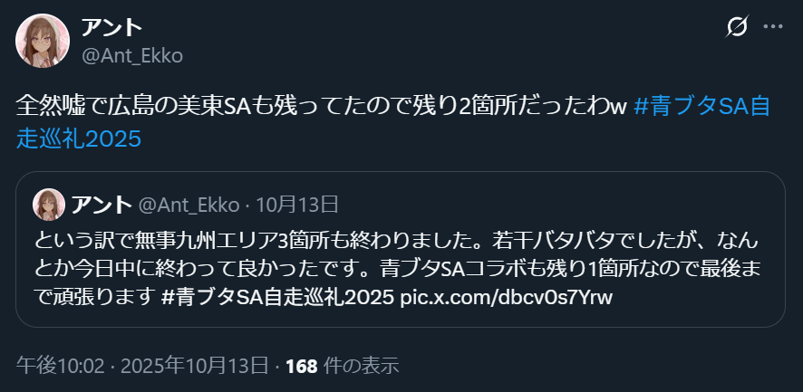 同期間、旅行雑誌「るるぶ」でも青ブタとコラボしたSNSキャンペーンを実施していたので、道中のSAではできる限りキャンペーン投稿を実施。最終的にかなりの量の引用ポストをしてしまったので、荒らし・いたずら判定を運営側に受けていないか心配なところではある。本人は真面目にやっています。