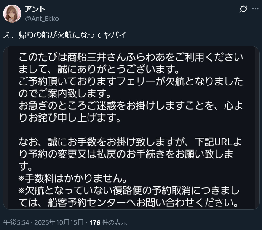 フォロワーから「フェリーの車両積載枠はすぐに埋まるから早めに確保したほうが良い」という助言も受け、実施予定日の2週間前にはフェリー・宿の予約を取った。この時点で