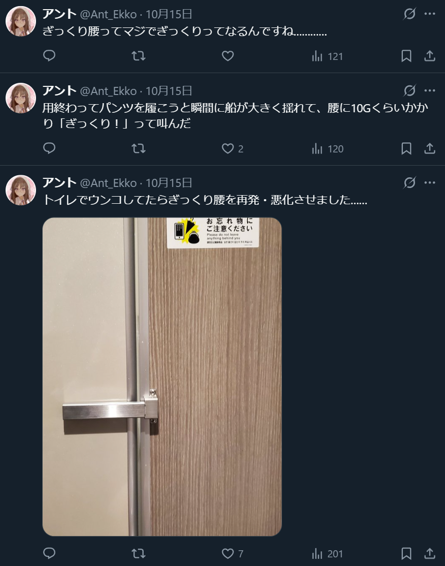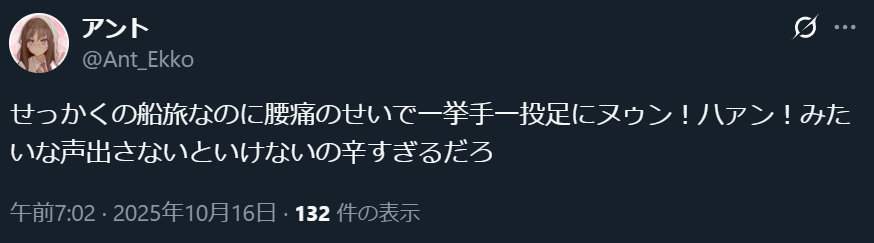 これ以上船の話を書いても腰が痛いエピソードしかないので、さっさと次に移る。